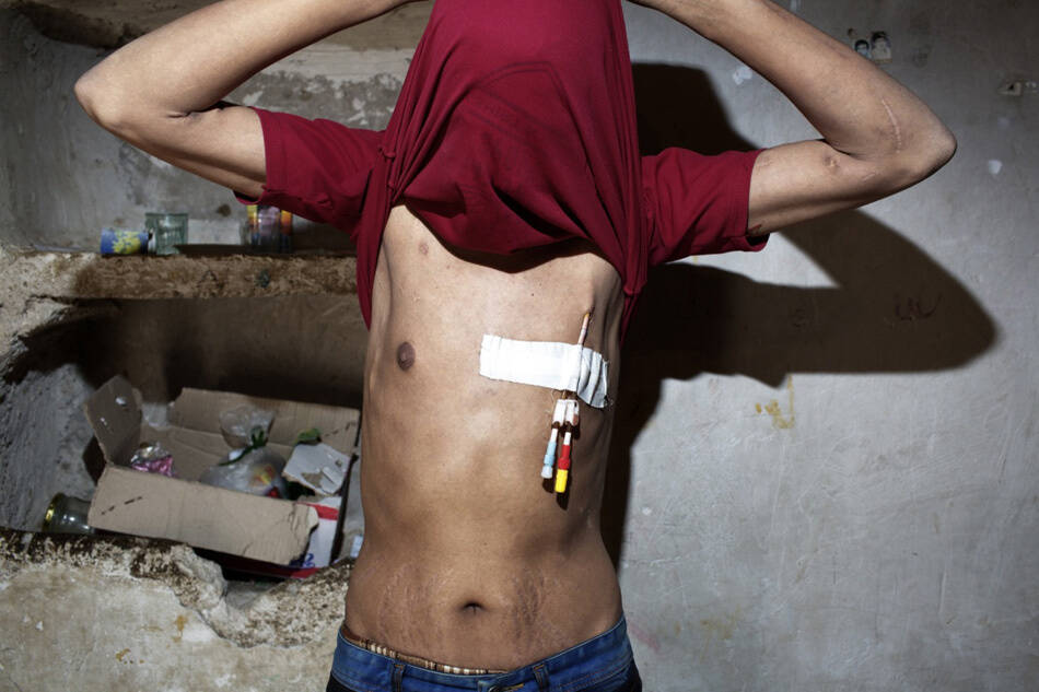 “我以为移植以后加法尔会过上更好的生活,但是我的肾没有起到作用。我想是上天不同意我捐肾给加法尔。上天对我不高兴。”她告诉我加法尔的父亲曾经到医院去投诉。“他们的答复是,那个肾对加法尔来说太大了,他们说之前已经警告过加法尔。但他们说的不是真的。” 伊朗是世上唯一卖肾合法的国家。摄影师Francesco Alesi记录了一名患肾衰的年轻人私下购买肾脏并进行移植手术的全过程。图为加法尔,24岁,和他的家人一起见同意出售自己肾脏的女孩纳琳。
